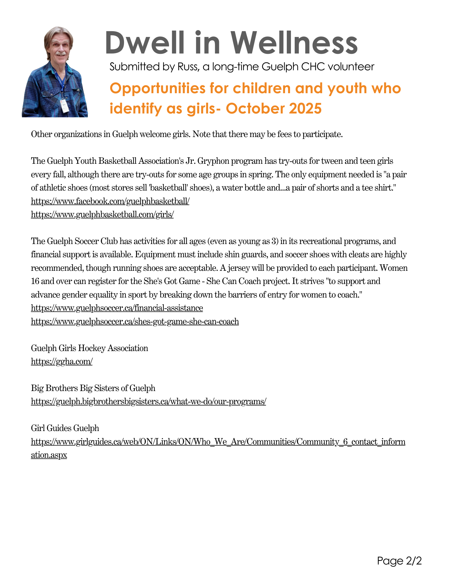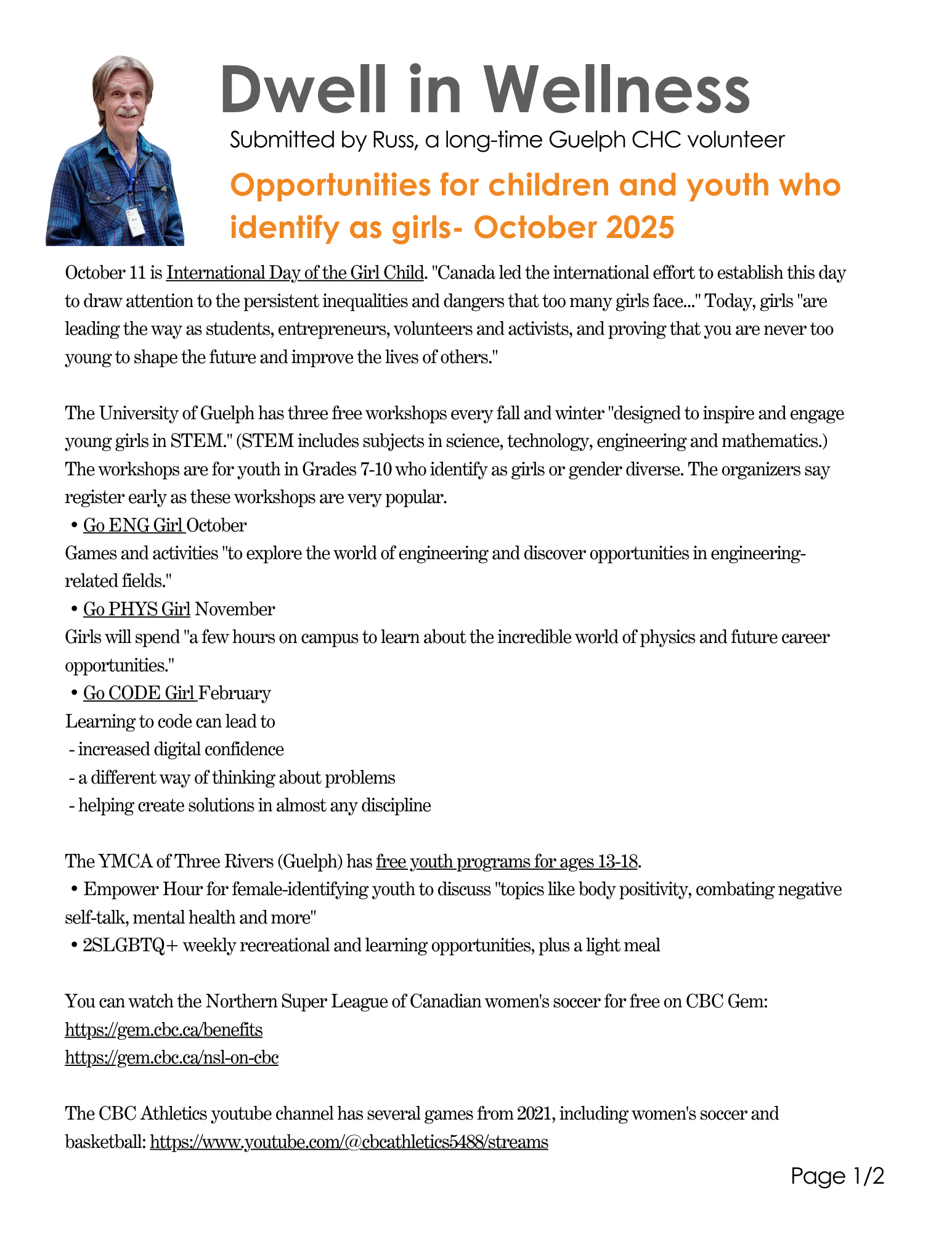 October Dwell in Wellness: Opportunities for children and youth who identify as girls- with clickable links