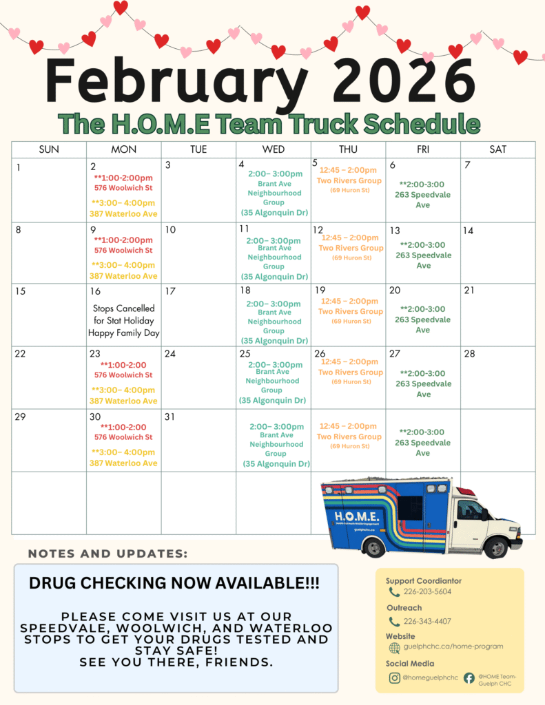 The HOME team operates from an outreach vehicle in the City of Guelph. We also offer referrals to ‘place-based’ (not mobile) health supports.